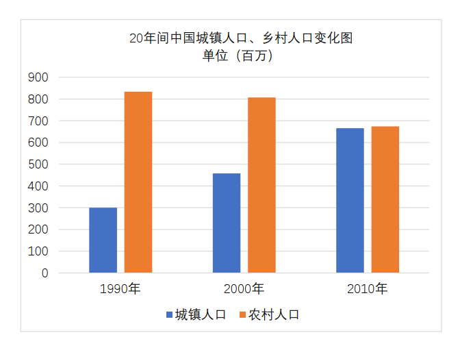 As is numerically illustrated in the statistics (about urban and rural population), the number of urban population increased from 300 million to 666 million (in the 20 years) between 1990 and 2010. While the number of rural population decreased from 834 million to 674 million between 1990 and 2010. From my perspective, the above figures reveal a currently prevailing tendency among contemporary society.